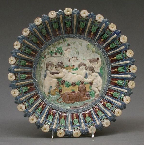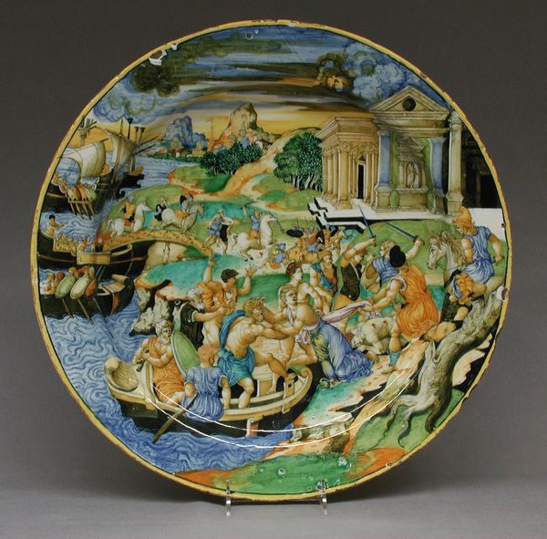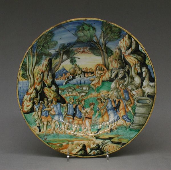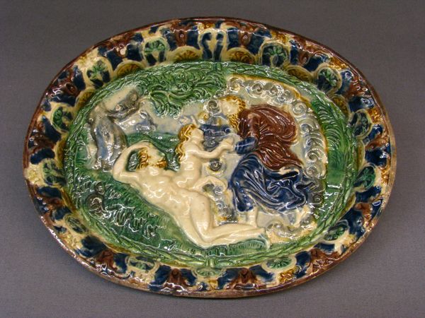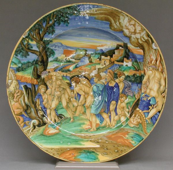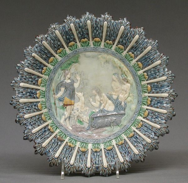 This is a glazed earthenware plate made by Bernard Palissy around the 16th century. The striking, sculptural relief and vibrant colors immediately capture our attention. Palissy models the plate with a scene from classical mythology, likely Diana and Actaeon. The composition is cleverly organized in layers, drawing the eye from the figures in the foreground, towards the drama unfolding in the background with a focus on a beast. The raised figures create dynamic shadows, giving the scene depth and a sense of movement. Palissy employs color to differentiate the characters and elements, with earthy greens and browns contrasting against the pale skin tones and blue garments. Palissy’s approach to form here is quite innovative. The high relief transforms the functional object into a tableau, challenging the conventional boundaries between decorative and fine art. The plate operates as a semiotic device. It invites us to decode its symbols and reflect on its themes of transformation, voyeurism, and divine retribution.
