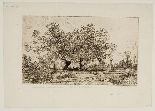 Editor: Here we have Albertus Brondgeest’s “Landscape with Oak Trees and Man near Water,” etched sometime between 1796 and 1849. It feels like such a still and contemplative scene. What strikes you most about the composition of this landscape? Curator: Immediately, the dominance of the oak takes precedence. Its formidable structure fills a significant portion of the pictorial space, directing the viewer's eye through a calculated recession into depth. Notice how Brondgeest employs delicate hatching and cross-hatching to differentiate the textures of the foliage from the smoother surfaces of the water and sky. Editor: The way he uses light and shadow is so subtle. Almost ethereal. Curator: Precisely. The interplay of light, strategically placed, models the forms and generates a palpable atmosphere. Are you observing how the artist juxtaposes the intricacy of the tree's branches against the open expanses? It lends itself to notions of the sublime and the individual's insignificance when facing nature. Editor: So, you see this as less about the actual location and more about Brondgeest exploring these broader philosophical ideas through form? Curator: Indeed. The landscape transcends its representational function. It’s in the contrast, scale and detail that the drawing truly communicates its intention. Can you notice how your eyes are invited into a hierarchy of detail? Editor: Yes, you can really appreciate his use of the etching technique to create these intricate lines, highlighting both the immense scale of the oak, but also that of nature itself. This gives one a very grounded feeling about this very moving work. Curator: I concur; an engagement with Romantic ideals and picturesque design are certainly embodied.