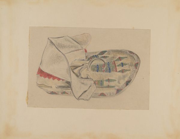 This delicately rendered watercolor, titled 'Belt' by Mary Berner, offers us a glimpse into late 19th-century material culture. Berner, born in 1855, lived in a society undergoing significant shifts in gender roles and cultural identity, especially for Native American women. Here we see a beaded belt depicted with careful detail, a fashionable accessory that could signify both personal style and cultural identity. During this period, beadwork was not only a traditional craft but also a form of economic and cultural expression for Native women. Berner may be communicating the intricacies of identity—how fashion and adornment can carry layers of meaning. The belt seems to capture a moment of transition, reflecting both the adaptation to mainstream fashion and the persistence of Indigenous artistry. This image prompts us to reflect on how everyday objects can embody complex negotiations of identity, tradition, and change.