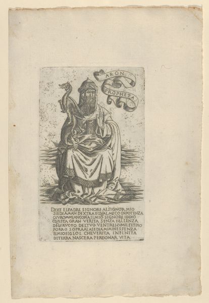 Editor: This is Francesco Rosselli’s engraving, "The Prophet Noah, from Prophets and Sibyls," dating back to the late 15th century. It feels so intricate and dense, especially the details of Noah and his… birdhouse? How do you interpret this work, focusing on the composition? Curator: Certainly. Structurally, observe how Rosselli uses line—particularly the density and direction of those lines—to articulate form and suggest depth. Consider, for instance, the stark contrast between the detailed rendering of Noah himself and the more schematically depicted background. Note also the use of perspective to frame and give precedence to the architectural 'birdhouse', you referenced; how would you unpack that as a formal element? Editor: Well, the way Noah is presented, and the positioning of the birdhouse make it the focus, drawing the viewer’s eye. Curator: Precisely. The engraving’s texture, created through varied line work, creates visual interest, guiding our gaze and underscoring specific aspects, notably Noah's serious mien and the rigid structure he gestures toward. These visual strategies construct meaning. Editor: So, it’s the relationship between these elements—the lines, textures, and the way they emphasize certain forms—that unlocks the meaning, even beyond the religious context. Curator: Indeed. The interplay of these intrinsic visual elements allows the piece to function as a complex, self-referential system open to interpretive play, going beyond merely illustrating a biblical figure. Editor: I never thought about a religious piece in terms of its lines and textures! That shifts my perspective completely. Curator: Examining the art through its own visual language truly expands our understanding and interpretation of works of art.