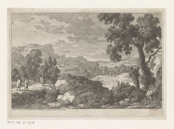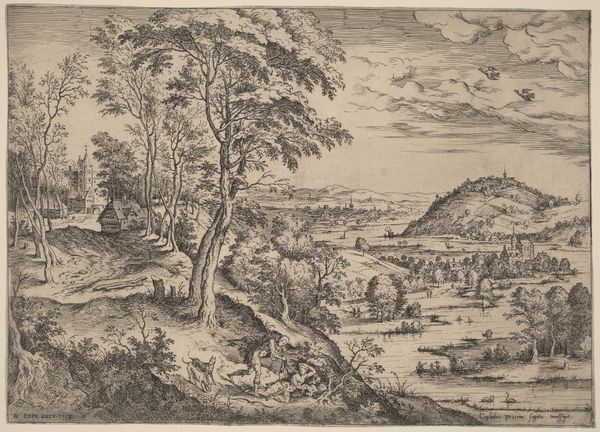 Here is a landscape with a river, made with etching by Monogrammist MEG. The eye is drawn across a vast panorama constructed with fine, deliberate lines, creating gradations of light and shadow. Notice how the composition uses a strong diagonal from the lower left, where a figure leads a donkey, up towards a distant, elevated structure. This line guides our gaze through the scene, creating a sense of depth and movement. The artist’s strategic use of hatching and cross-hatching not only defines the forms of the landscape, but also contributes to a rich, textural surface. Consider how the density of the lines varies, creating areas of darker tone that contrast with the lighter, open spaces. Semiotically, this manipulation of light and dark might be interpreted as a symbolic representation of the known and unknown, or the civilized and the wild. Ultimately, this landscape functions as a meditation on the sublime, where the natural world is both beautiful and overwhelming, and where the act of representation becomes a philosophical inquiry into the limits of human perception and understanding.
