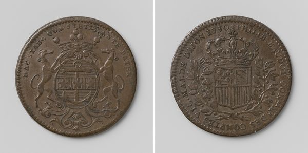 Curator: Today, we're looking at the Vroedschapspenning of the city of 's-Hertogenbosch, created between 1714 and 1720 by Theodorus Casparus van Berckel. This piece, crafted from metal, is a fascinating example of Baroque-era relief sculpture. Editor: It's so intricate! My first impression is how stark the imagery feels. The precision in such a small format is astounding. It feels incredibly dense with information. Curator: Absolutely. Van Berckel really uses the limited space to its full potential. Note the sharp, deliberate lines; the clarity and texture work to create a structured, symbolic composition. The arrangement—almost a perfect circle, divided into halves—establishes a clear binary. Editor: It makes me wonder about the labor involved in producing such detail on metal. What tools were used, and what would a craftsman's daily life have been like during that era in 's-Hertogenbosch? The material itself speaks of value and permanence, indicative of civic pride. Was the creation of such a piece a community affair? Curator: That’s a very astute observation. Looking at the reverse, you can see the architectural rendering—likely of the city hall—which adds another layer of meaning. This architectural portrait functions almost like a visual contract, demonstrating the city's order and reason. Editor: Right, that resonates with the material used—the choice of metal here acts as more than a purely aesthetic preference. Was this perhaps commissioned to signify something—maybe solidifying trade agreements or memorializing something of communal value? Also, do we know where the metal was sourced? The very location from where it was sourced holds its own story, potentially influencing how the community engaged with the resulting imagery. Curator: Exactly. We know that these types of “city coins” served multiple purposes—awards, records, diplomatic gifts—they weren’t everyday currency. Van Berckel successfully elevates a practical object into an emblematic work of art. Editor: I agree. Investigating this city coin underscores how closely craft, labor, and material context can be intertwined with visual language to create a really powerful cultural statement. Curator: This piece continues to be a window into the complex history and symbolism embedded in seemingly simple objects. Editor: Indeed, it inspires a deeper look at not just what we see, but how such an object came to be and the labor that went into the end result.