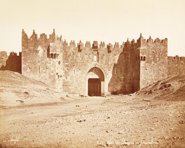 Curator: Looking at this photographic print from Maison Bonfils, circa 1867-1895, titled "Publiek voor de Damascuspoort in Jeruzalem" from the Rijksmuseum collection, I’m immediately struck by the monumentality. Editor: It's a powerful image. The stark contrast and heavy stone give a sense of timeless endurance. It evokes a feeling of being suspended between epochs. Curator: Indeed, photography during this period became a significant tool for documentation, often commissioned to capture distant lands and architectural marvels. The albumen print process would have been painstaking. Consider the labor invested in its making – the preparation of the light-sensitive emulsion, the careful posing of the figures… it speaks to a very different understanding of image production than our own digital era. Editor: Absolutely, but I also think it speaks to a Western gaze on the "Orient". These images weren't just neutral records. They shaped perceptions and reinforced colonial power dynamics. We must question who is being centered, whose stories are amplified, and whose are obscured. The photograph aestheticizes a very complex space with its attendant power struggles, economic realities, and sociopolitical forces. The image offers a kind of "frozen" perspective which then influences its audience. Curator: You're right to challenge that perspective. The gaze, undoubtedly, shaped what was recorded and how it was framed. Yet, even within that context, the materiality persists. Look at the details captured on the gate's stone surfaces. That’s also part of what speaks to this image. It's fascinating to consider the image’s dual existence: as a historical record and a product of industrial labor. Editor: I agree; seeing both sides makes a complete interpretation. Understanding its place in visual history is also crucial, it also offers insight into Orientalist tropes that are still prevalent today. We are always enmeshed in larger, complicated historical narratives, and each image carries its share of responsibility. Curator: It’s a dense web to untangle, I appreciate getting both views on such a photo. Thank you. Editor: Thank you, and understanding is key. Recognizing that duality provides a deeper understanding of the historical context, power, and materiality embedded in this image.