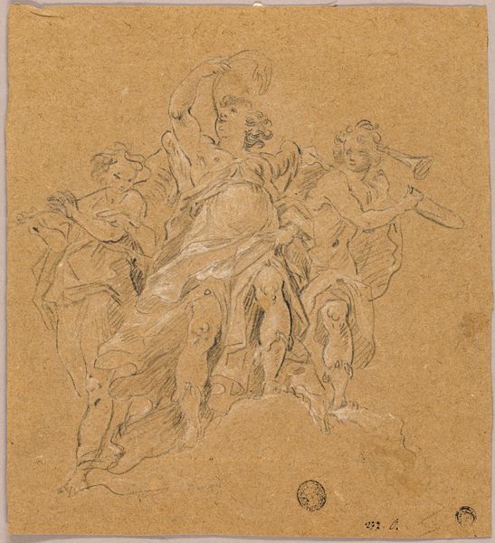 François Verdier created this drawing of Apollo and his horses with black and white chalk on paper. The material itself lends a softness to the image; the chalk allows for subtle gradations of light and shadow, creating a sense of depth and volume, as if the figures emerge from a misty realm. Verdier’s technique emphasizes the inherent qualities of the chalk, exploiting its capacity for blending and feathering. The strokes follow the contours of the forms, suggesting the muscularity of the horses and the god's youthful figure. This approach to drawing reveals a deep engagement with classical artistic traditions, connecting it to the skilled practices of the Renaissance. The work involved in creating such a detailed composition would have been considerable, requiring careful planning and execution to achieve its refined aesthetic. Considering the materials and processes employed by Verdier enriches our appreciation of the drawing, underscoring the intersection of craft, skill, and artistic vision.