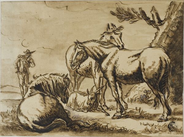 Curator: This intriguing work is titled "Two Horses Fighting Dog" by Johann Georg Pforr, an artist working in the early 19th century. The piece uses colored pencil, chalk, ink and graphite on paper. Editor: The title promises conflict, and the artwork certainly delivers. I'm immediately struck by the tension. It feels almost theatrical, a stage set for a drama. There's something classical in its composition but rendered in such delicate materials. Curator: The use of those varied mediums really serves to depict a narrative of power, reflecting societal tensions of the time. Looking at it from an intersectional perspective, how might we interpret the animal dynamics within a patriarchal power structure? The dog’s positioning beneath the horses suggests a certain submissiveness, for instance, or even forced subservience. Editor: Interesting point. Visually, the dog certainly looks like a disruption – an interruption in the natural order. We often see the dog as a symbol of loyalty, yet here, it appears aggressive, maybe even goaded into action. This adds another layer to the dynamics of dominance being portrayed, don’t you think? It also reminds me of those images of royal hunts. Curator: Precisely! And notice the idyllic landscape. Even that seemingly tranquil setting has a symbolic weight, perhaps representing the fragility of peace maintained through unequal power relations. Consider how frequently artists deploy images of "nature" to excuse human social and political hierarchies as somehow 'natural' too. Editor: That's a vital connection to draw. On the other hand, could the image perhaps symbolize some personal struggle? We've often used the horse as emblematic of inner strength or unchecked passion, its stance here so agitated – raising one leg and about to either stomp the dog, or run away from the fight. Maybe Pforr projected a bit of himself into the animal figures as metaphors for psychological states? Curator: I think the beauty of the piece is that it accommodates both interpretations. We can analyze the sociopolitical implications while also recognizing the artwork's potential to express profound personal emotions. Editor: Indeed, by looking at those competing viewpoints we get a deeper understanding of this complex drawing and its possible meanings, both in its time and our own. Curator: Ultimately, I’m drawn to the subtle activism embedded in his work, highlighting themes relevant to power dynamics that persist to this day. Editor: It seems even seemingly simple images carry many potent symbolic truths. I will look at horses, dogs and landscapes in art with fresh eyes from now on!