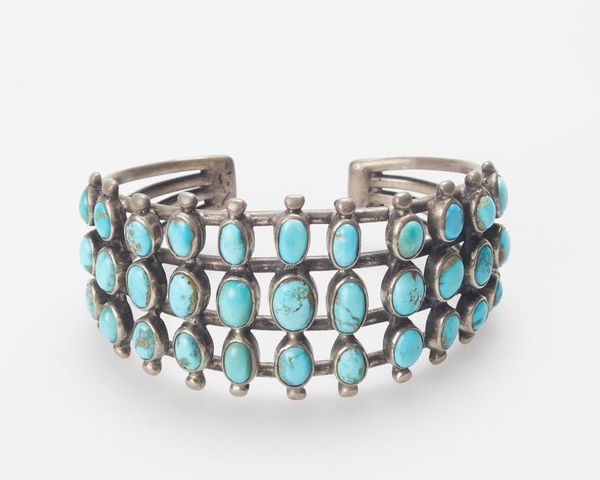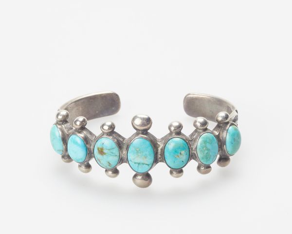 Editor: Here we have a silver bracelet, probably from the late 1940s, crafted by Bert Puhuyestiwa. The metal is punctuated by a series of striking turquoise stones. It's gorgeous, yet its simplicity lends it a peaceful quality. What symbolic meaning can we unpack here? Curator: The use of turquoise is particularly compelling. It appears frequently in Indigenous cultures as a powerful symbol, connected to the sky and water – both vital for life. Think of its presence, emotionally: calming like a clear sky, refreshing like cool water. Do you notice any patterns in the arrangement of the stones? Editor: Yes, there are larger, oval stones, each framed by smaller, round ones, and all mounted on the silver band. It’s quite symmetrical and balanced, which gives it that feeling of serenity, I think. Curator: Symmetry is crucial, echoing the harmony sought within the natural world, especially through traditional practices. These gems aren’t just decorations; they function as conduits. Through symmetry and its calming essence, the stones invoke blessings, ensure well-being. Each design element serves as an indicator of cultural memory and identity. Can you envision someone wearing this piece? Editor: I can. Perhaps wearing it during ceremonies? Knowing the depth of symbolism adds a richer layer to what I initially perceived as just a pretty piece of jewelry. Curator: Precisely. Jewelry transcends mere adornment; it becomes a tactile expression of one's heritage, a walking emblem of enduring beliefs. I would describe it as a manifestation of visual history. Editor: That's a very enlightening approach. Looking closely at design elements can indeed uncover fascinating meanings, connecting us more deeply to both the artwork and its cultural roots.