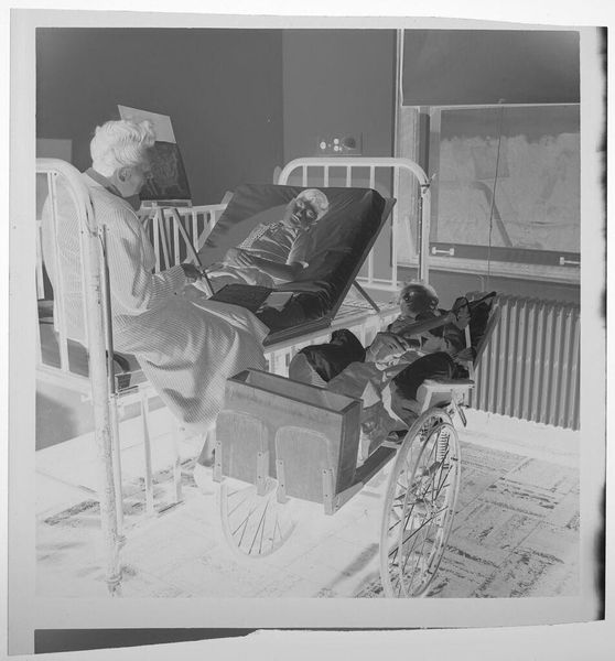 Curator: This is an untitled work by Jack Gould, presenting two children in what appears to be a hospital setting. The somber tonality immediately strikes me. Editor: The image definitely has an air of melancholy. I see the wrought iron of the beds, the textures of the linens, and it all seems to speak to institutional care and perhaps even isolation. Curator: Absolutely. Considering the context of healthcare, particularly for children, this image seems to me to be steeped in themes of vulnerability, dependence, and even the socio-political aspects of access to care. Editor: The materials are quite stark, aren't they? You have the cold metal contrasting with the softness implied by the linens. I wonder what the labor conditions were like for those producing these beds and linens, and how that labor impacts the children's lives. Curator: It certainly invites reflection on disparities and the systems that impact the most vulnerable among us. Editor: Indeed, it makes you consider the layers of hands involved in every object within the frame. Thank you for these insights. Curator: And thank you for grounding the discussion in the tangible. It gives us much to contemplate.