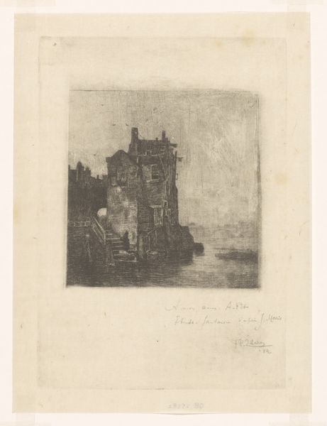 Philip Zilcken made this etching of houses on the water, but we don't know precisely when. The image presents a composition of buildings alongside a canal, likely created in the Netherlands. Consider how specific features of Dutch culture might have influenced the artwork. During the late 19th and early 20th centuries, the Netherlands experienced significant urbanization and industrial growth. Picturesque scenes of waterways and buildings held nostalgic value, reminding viewers of a simpler, pre-industrial past. The etching technique itself, with its emphasis on line and detail, reflects the influence of the Dutch tradition of printmaking. Zilcken may have been making a subtle comment on the rapid social changes of his time. Was he self-consciously conservative in his approach, or was he subtly critiquing the march of progress? Historians interested in this kind of question can consult archival sources such as period newspapers, city planning documents, and exhibition catalogues. Through research, the role of art can be better understood in the context of its production.