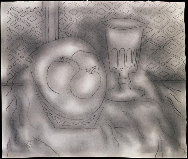 Editor: This sketch, "Still Life (Guitar, Fruit, and Glass)" by László Medgyes, presents a familiar scene in a somewhat stark manner. What cultural associations do you think the artist might be playing with? Curator: The arrangement feels deliberately staged. Notice how the guitar, fruit, and glass, archetypal symbols of leisure and pleasure, are rendered almost geometrically. What memories or cultural ideas does that provoke for you? Editor: It feels very Modernist, breaking down form. Curator: Precisely. It's a visual language meant to distill these objects to their essence, purging them of sentimentality. Yet, that very act becomes symbolic, reflecting a desire for clarity after periods of turmoil. Editor: So, it is a new visual language rooted in memory? Curator: Exactly! The symbolic past is always informing the visual present. Editor: I see now, thank you!