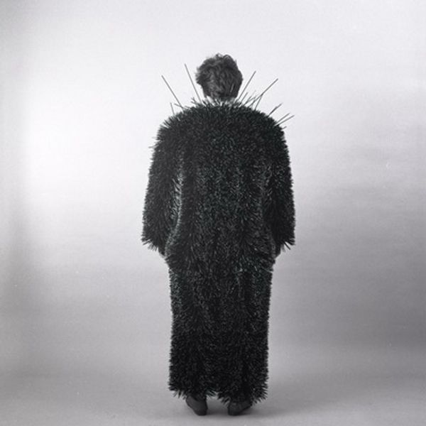 This is Ann Hamilton's black and white photograph, "body object series #13, toothpick suit/chair". The neutral palette really highlights the tactile qualities of the materials. You know, artmaking is really about process, and here, the process is everything. The image shows a figure wearing a suit and carrying a chair, both densely covered in toothpicks, each one individually placed, I imagine. It's the texture that grabs you. The sharp points contrast with the soft, furry effect from a distance. The toothpicks scatter on the floor emphasizing a kind of shedding or disintegration. Look closely, you can almost feel the prickle and the weight, the labor involved in making this peculiar garment. The suit looks almost like a protective shell, but also kind of vulnerable, like a walking pincushion. I'm reminded of Robert Gober's sculptures, everyday objects transformed through obsessive crafting. Hamilton, like Gober, takes something familiar and turns it into something strange and unsettling. Art embraces ambiguity. It’s not about easy answers, but about opening up new ways of seeing and feeling.