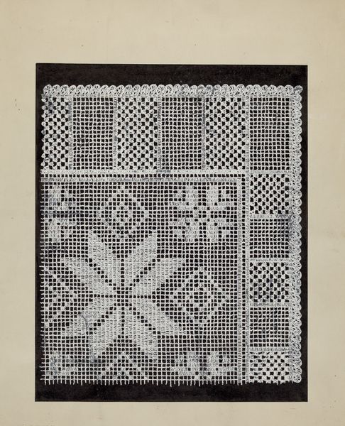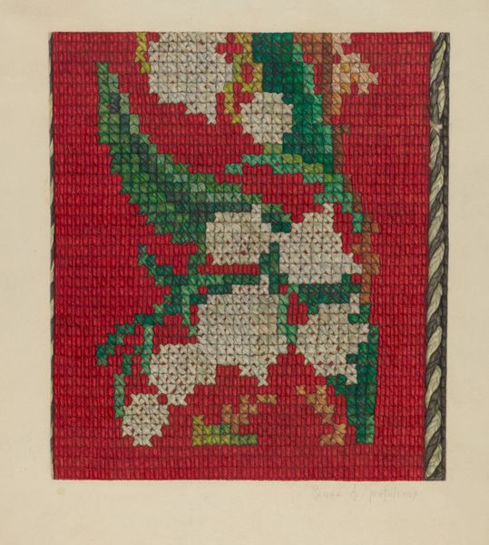 Editor: We’re looking at "Table Cover" from around 1936, it seems, made with textile, paper, and watercolor by Ruth M. Barnes. It has a very pixelated, geometric look, almost like a vintage video game graphic. What can you tell me about this work? Curator: I see an intersection between craft and fine art here. Barnes is using traditional materials – textile, paper, watercolor – to mimic the look of needlepoint or cross-stitch. Consider the labor involved. Someone likely conceived this design, and the means to reproduce it required repetitive action, stitch by stitch. What does that repetitive process tell us about the role of "women's work" and domestic art versus "high art" practices? Editor: So, it's almost like she's elevating a traditionally domestic craft to the level of art simply by the materials she's using? Curator: Precisely! And also perhaps by divorcing it from its utilitarian function. This "Table Cover" isn't meant to be used as a table covering, but rather as a representation of one. It challenges our assumptions about artistic value. What labor is valued, whose labor is valued, and why? The use of watercolor on paper to imitate the texture of textile pushes boundaries, wouldn't you agree? Editor: I do! I hadn't thought of it in terms of labor and value. The deception makes me rethink it. It feels much more subversive now. Curator: The social context surrounding the production and consumption of craft objects in the 1930s also becomes crucial. Mass production was on the rise, but so was a renewed appreciation for handmade items as signifiers of authenticity and individuality. Editor: Right, it's a reaction against the mass-produced. Now that you mention it, I appreciate it so much more. Curator: Seeing how everyday objects like a table cover, become a medium for artistic expression helps appreciate the unseen labor woven into the fabric of our lives.