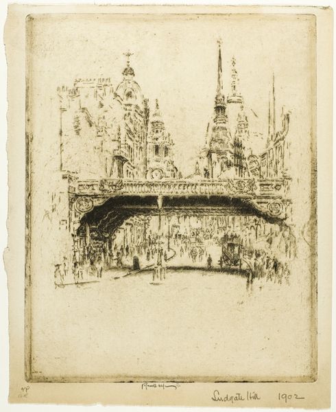 Curator: Up next we have Joseph Pennell's "London Bridge Stairs," an etching created in 1903 that offers a glimpse into London's bustling cityscape. What's your immediate take on this print? Editor: The immediate sensation is one of density. The artist has captured London's tangible history, brick by brick, echoing within. There’s a somber weight to it; the air seems heavy. Curator: It’s fascinating to consider the time. Pennell created this during a period of intense urban development and social change in London. The etching technique lends itself so well to documenting this grittiness. Editor: Etchings possess such inherent capacity for detail and nuanced symbol placement, don't they? I'm especially drawn to the way the water reflects the bridge, like a subconscious mirror of progress—and the small figures, hinting at larger collective dreams, a testament to London's perpetual narrative. Curator: Absolutely. Consider that the bridge wasn't just a means of transport. Bridges, historically, signify connection, points of access. Pennell, an American, likely felt that pull acutely, viewing London as both a familiar and foreign space. The viewpoint he has chosen showcases his relationship to this subject. Editor: A transitional zone indeed. One cannot forget the potent iconography of water and bridges! Water holds cleansing and transformative attributes in many cultures, as does the journey across a bridge which denotes passage from one state to another, whether actual or spiritual. The stairs provide access to this new world. Curator: I hadn't thought of it in terms of access and opportunity for many individuals, rather than as a singular crossing for societal segments. Editor: Precisely. And note the sharp contrast with the sky's pale tone and the structure's darker ink tonalities. It brings an emotional weight, setting this in the specific space, yet it stands representative for much more. Curator: A truly evocative rendering of London's intricate layering, seen both as a physical space and symbolic passage through societal transformation, doesn’t it? I have found a completely new view of the work because of your interpretation. Editor: And your understanding of the history of London itself provides me new lenses to envision this artwork, I may view this for years to come!