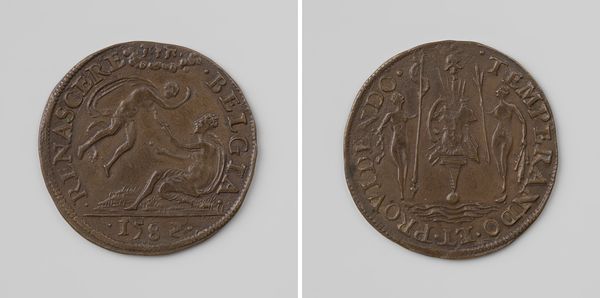 Editor: So this print from 1620 depicts Albert and Isabella of Austria. The inscription calls it "Bescheidenheid" or "Modesty." It seems to be printed on a bronze or copper coin, which I find unusual. What are your thoughts about it? Curator: The choice of metal and its production process are significant here. Striking a medal like this wasn’t merely about creating an image; it was about manufacturing consent and projecting power through a reproducible, distributable object. What message does that materiality convey about their reign, do you think? Editor: Maybe that they were trying to project stability, something solid and lasting? Given the ongoing conflicts at the time, creating something permanent from metal sends a signal of strength. Curator: Precisely. The metal itself—the cost, the labor involved in mining, smelting, and striking—it all speaks to an economy of power. Look also at the imagery: the anchor, the intertwined rope. Consider how the engraving would have required specialized labor. How does the imagery speak to their aspirations? Editor: I see… the anchor symbolizes hope and stability, something solid and enduring. Almost like they are marketing themselves. It makes you consider their use of resources for this medal. Curator: Exactly! Consider how portraits are commodities, then and now. In using such robust, lasting materials and a process that ensured mass production, Albert and Isabella aimed for broad dissemination of a specific image: one of modest, reliable, divinely-ordained rule. The coin transcends art, functioning more like propaganda by manipulating the use of materials, which influenced labor. Editor: That really changes how I see it. I was focused on it being a portrait, but thinking about it as manufactured spin using precious materials is fascinating. Thank you. Curator: My pleasure. It is always productive to re-evaluate works of art from various viewpoints.