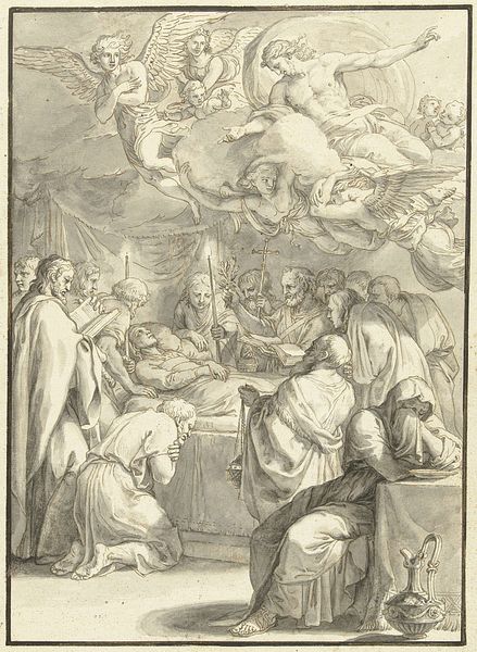 Editor: We're looking at Johann Sadeler I's engraving, "The Death of the Virgin," created sometime between 1567 and 1600. It has a somber feeling, amplified by all the figures surrounding the Virgin Mary, with angels swirling above. What cultural significance did such depictions of the Virgin's death hold? Curator: These depictions played a critical role in the religious and social landscape. Think about the context of the Counter-Reformation. The Catholic Church, facing challenges from Protestant reformers, reaffirmed core doctrines, including the importance of the Virgin Mary. How do you see this reflected in the image's composition? Editor: I notice the apostles gathered around her bed look concerned. Then there are angels reaching down, creating a kind of heavenly approval. Curator: Exactly! Images like this one reinforced the Virgin’s sanctity and her central position in the Catholic faith, meant to inspire faith and reinforce tradition in an era of religious upheaval. The elaborate detail achieved through engraving—the textures, the drapery—conveyed a sense of divine glory that aligned with Baroque aesthetics. The use of portrait-like qualities also invite an almost personal reflection on the death of a mother-like figure. Editor: It's interesting how the artwork is part of a larger social and political conversation. How it can shape and spread different perspectives. Curator: Precisely! Engravings like this were often circulated widely, becoming powerful tools in disseminating religious ideology and solidifying the social role of art as a carrier of values. Reflect on this—art doesn't just reflect, it actively participates in constructing and maintaining systems of belief. Editor: It definitely changes my perspective. I'll look more at the intentions behind a piece next time. Curator: That's precisely the kind of awareness we aim to foster – looking at the artwork's role within broader narratives.