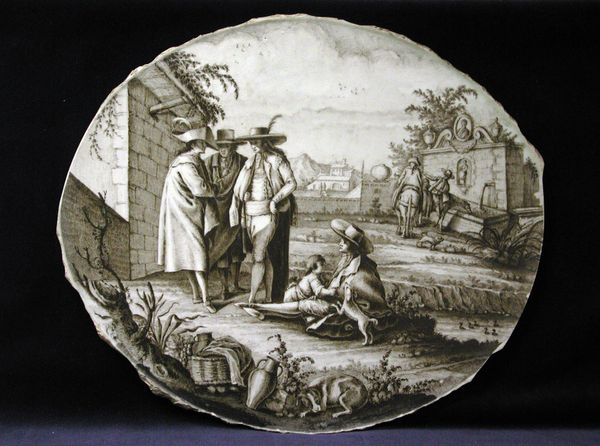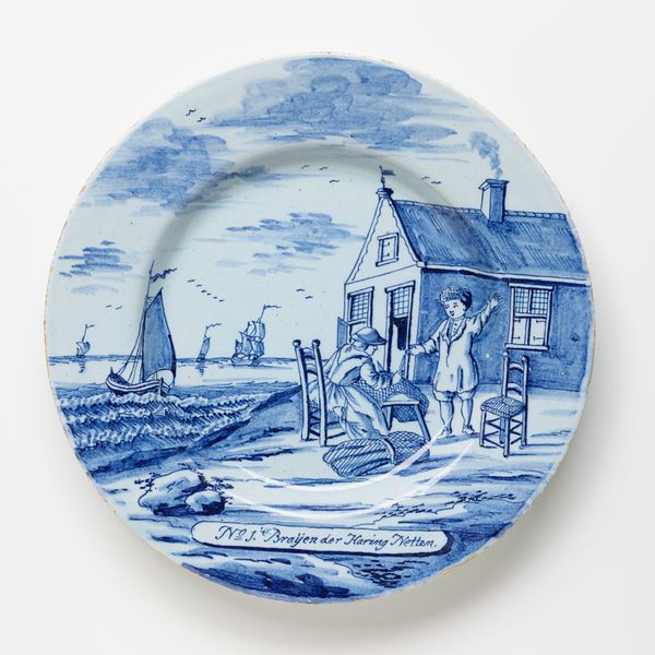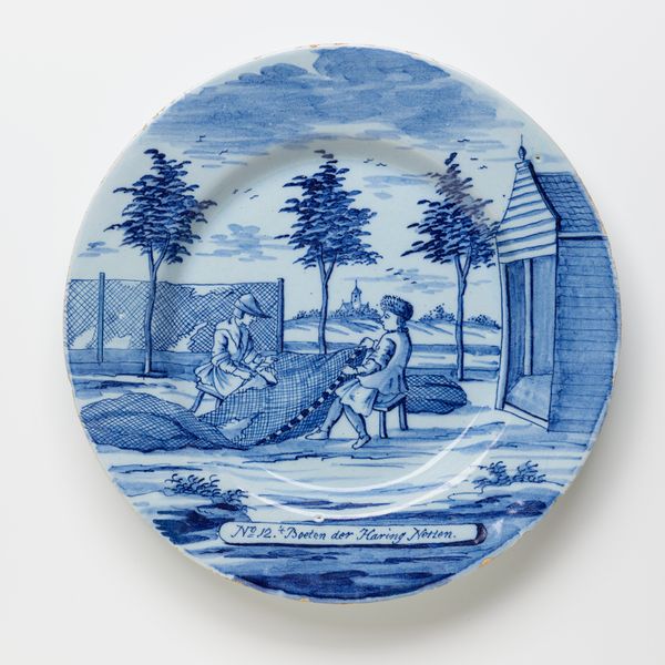 This tin-glazed earthenware plate, by De Porceleyne Bijl, presents a scene rendered in a limited palette of blues and whites. The circular form contains a pastoral vignette, bordered by stylized foliage, which evokes a sense of bucolic calm. The composition arranges human figures and animals engaged in sheepshearing across a subtly implied landscape, with buildings in the background. The artist’s application of blue varies in intensity, creating depth and texture. Linear strokes define the forms, giving shape to the figures and emphasizing the contrast between light and shadow. The plate’s semiotic structure suggests a reading beyond mere pastoral representation. The depiction of labor, set within the domestic sphere of the plate, implies a negotiation of labor and leisure. This piece challenges fixed interpretations, inviting us to consider the values and social codes embedded in its simple, agrarian scene.