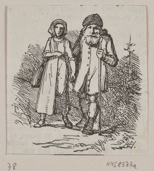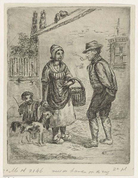 Curator: This engraving, attributed to H.P. Hansen and entitled "Illustration til \"Kulbrænderen\"" –dating roughly between 1829 and 1899 –presents a vignette of rural life. What are your immediate impressions? Editor: Stark. The heavy blacks create a world where every wrinkle in a garment and line on a face is etched with hardship. It is immediately evocative and a bit bleak. Curator: I agree. And notice how Hansen positions these figures in front of a rather simple dwelling, emphasizing their connection to a specific locale. It speaks to the social realities and perhaps even the romanticization of rural life prevalent in art of that period. Genre painting gaining momentum. Editor: The woman, with her headscarf and the wooden bucket, and the man's gesture feel performative. There’s a theatricality, like a scene plucked from a folk tale. The dog, I find interesting; its presence provides a grounding in the mundane alongside such deliberate posing. Curator: A theatricality very much in keeping with the tradition of illustrating popular literature, I believe. "Kulbrænderen", if it's indeed "The Charcoal Burner", likely told a dramatic story to which Hansen here gives a visual form. The imagery definitely aims to strike an emotional chord with its viewers, reflecting social dynamics through relatable characters. Editor: The charcoal burner! The sooty trade. And I am fascinated with how archetypes are evoked: the modest woman and her caretaker's work, a bit idealized, set against this weather-beaten figure in what seems to be a confrontation. There’s definitely a loaded symbolic landscape condensed within these lines. Curator: Quite so. We can trace the emergence of these folk-infused visuals. This period reflects a growing sense of national identity; the illustrations aimed to resonate with cultural memories. These genre paintings offer important insights into a specific chapter of artistic interpretation of a nation's narratives. Editor: Considering how images help weave our shared history and experience, this piece, simple as it is, gives a compelling picture of social life at that time, resonating with audiences on many layers, artistic and contextual. Curator: Absolutely. An engagement with the everyday presented for moralizing, narrative, or often both! Hansen's illustration offers a glimpse into the intertwined cultural, social and literary aspects that were at play.