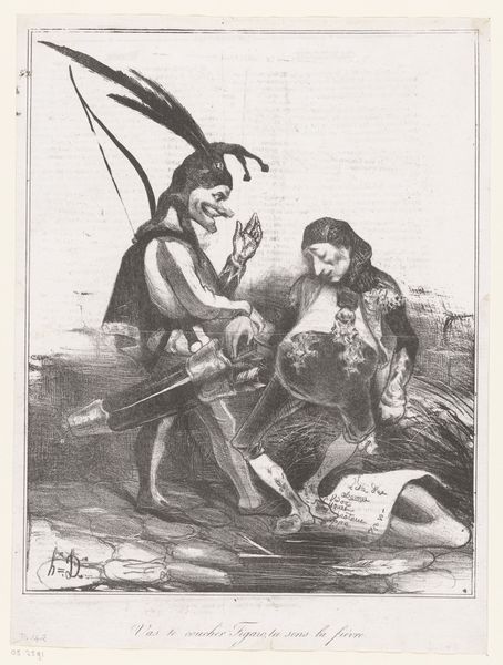Curator: Daumier's "Introduction of Ulysses to Nausica" presents a scene of stark contrast; Ulysses, disheveled and raw, confronts the refined sensibility of Nausica and her attendants. The work is rendered in lithograph, a medium ideally suited to capture the nuances of light and shadow. Editor: Oh, it's marvelous! So immediate and unsettling. The rawness of Ulysses against that sea of pristine linen... it’s as if a storm has just washed him ashore, both literally and emotionally. Curator: The composition emphasizes this disjunction, doesn't it? Note the strategic use of line—the diagonal thrust of the coastline dividing Ulysses from the clustered figures of Nausica and her maidens. Editor: Exactly, and the dramatic chiaroscuro amplifies Ulysses's primal state. He's almost animalistic in his urgency, a stark contrast to the almost porcelain composure of the women. I wonder, does this juxtaposition challenge or reinforce the power dynamics at play? Curator: It does both, I think. Daumier captures a collision of worlds, where vulnerability meets privilege, and the echoes of Homer resonate even today. Editor: Well, whatever it does, the lithograph definitely leaves an impression.