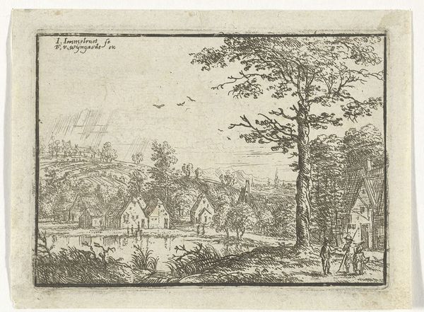 Editor: This is Bernardino Capitelli's "Bridge Over the Ombrone River near Buonconvento," likely from 1629. It’s an engraving, quite detailed. The scene is populated with figures, giving it a narrative feel. What can you tell me about its historical significance? Curator: It’s interesting to view this through a lens of power and representation. Consider who commissioned such a work and why. We see a scene seemingly documenting a bridge and figures crossing. However, early modern prints often functioned as political tools. How does the artist depict the landscape and figures to project authority? Editor: That’s a good question. The figures on horseback appear more prominent than those on foot or working on the bridge, emphasizing a social hierarchy. And what's the deal with the cartouche and emblem above the image? Curator: Precisely! Those details are key. That’s the coat of arms of the House of Medici, the rulers of Tuscany at the time. Including it reinforces their dominion over the depicted territory. The print not only depicts a place but claims it visually and politically. This artwork also demonstrates their investment in infrastructure and public image through prints widely available for consumption, therefore communicating an active administration of territories to audiences within and beyond the duchy. It suggests an investment in progress, security and trade, for whom does such messaging serves? Editor: It's like a 17th-century press release! I never thought about landscape engravings functioning that way. Curator: Exactly! The art world and political power have always been intertwined. Considering the social and historical context deepens our understanding and unveils the subtle ways power is conveyed through imagery. This isn't simply a depiction of a bridge. It's a statement about control and legacy. Editor: I will definitely look more at such works through the same power-related lens! Curator: Indeed! Next time we meet, you could share with me new such perspectives.