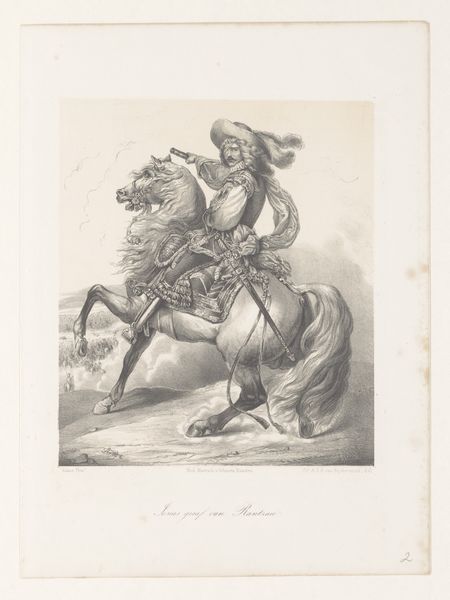 Curator: Here we have "Maximilian Emperor of Germany &c. &c., from Portraits of Royal Personnages," an engraving produced in 1814 by Hans Burgkmair. What are your first impressions? Editor: Stark and surprisingly modern. The limited contrast and shading create a flatter plane. And what's most interesting, the details of the man and his horse create an undeniably powerful image. Curator: Indeed. This work fits neatly into the Romanticism style of the time, but one could also categorize it as Academic Art given its subject matter and its meticulous attention to detail. The artist appears preoccupied with line and form, and there’s an admirable attention to the subject's features, posture and adornments. Editor: Certainly. Considering its historical context, this portrait says quite a bit about power and display. Maximilian is essentially presented as the ideal ruler, clad in armor as a reference to martial strength, further augmented by his regal bearing and equestrian skill. One imagines such an image aimed to cement authority and create a lasting impression of leadership, what with its ties to the past and ambitions for the future. Curator: Absolutely. The composition contributes to this end. The slightly elevated point of view and calculated placement of Maximilian against that classically rendered archway subtly enhances his commanding presence. Notice also the intricate work done on the plumes and on the horse’s armor, contrasting with the muted background. Editor: That contrast definitely reinforces the idea of Maximilian as both warrior and aristocrat. It’s a brilliant piece of calculated iconography. It raises questions about how leadership wants to be seen versus how it is actually enacted. Curator: Well put! Overall, "Maximilian Emperor of Germany &c. &c." offers a rich aesthetic experience through its thoughtful articulation of form, enhanced even further by a deeper historical investigation. Editor: Yes, this work not only exhibits Burgkmair's craft but is reflective of art’s lasting engagement with authority, legacy and image making. It remains relevant today as it encourages reflection on how public images of power persist across history.
