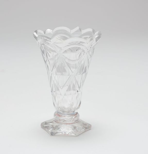The Mantua Glass Company made this vessel, a vigil light, from clear glass using industrial pressing techniques. Notice how the surface has a repeating pattern, almost like a honeycomb; this was created by a mold. Molten glass would have been forced into it, quickly taking its shape. While glassblowing is often associated with artistry, pressing was a faster, cheaper method, aligning with the rise of consumer culture. The thickness of the glass and its simple form speak to the vessel's function. It was intended for practical use, not necessarily display. The choice of clear glass emphasizes its purpose, allowing the light from within to shine through, unhindered. Considering its origins in a glass company, we can appreciate this humble object. It highlights the beauty and design inherent in everyday items produced through industrial means. It's a reminder that thoughtful design isn't exclusive to high art.