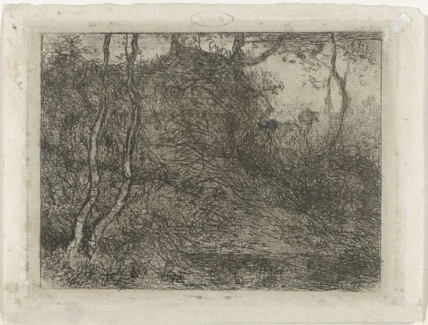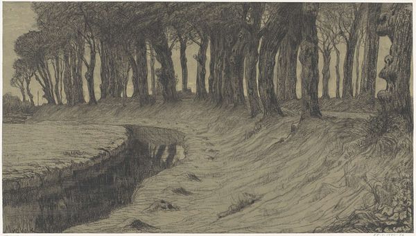 Curator: This piece is entitled "A Lonely Farm [Hawkridge]," crafted around 1900 by Robert Polhill Bevan. It appears to be a graphite drawing, or perhaps a print made from one. Editor: My first thought is of solitude. The stark, almost claustrophobic monochrome palette combined with the lone light in the house evoke a sense of stark isolation. Curator: Bevan, although associated with Impressionism, had a distinctive vision. Let's consider the social context: the late 19th-century agricultural shifts, rural exodus. Doesn't this image resonate with a narrative of societal displacement? What voices might have been excluded at the time that Bevan is giving space to? Editor: Indeed. And the materiality of the print or drawing further reinforces this. The density of the graphite suggests a weight, a pressure almost reflecting the manual labor involved in farming. It draws attention to the physical act of production, doesn't it? Bevan, who had connections with Gauguin, emphasizes surface in this work through his repetitive mark-making. Curator: I see how the repetitive mark-making embodies labor. There's an undeniable tension. The house, illuminated, provides a focal point amidst the encroaching darkness of the woods, like a symbol of both refuge and vulnerability. Are we, as viewers, implicated in the forces isolating that little light in the building, contributing to this narrative in a modern market-driven environment? Editor: Precisely! The printmaking process allows for replication and distribution, potentially democratizing the image but also turning this isolation into a commodity for urban consumption. There is so much texture from the layering of material and ink that really creates a stark contrast between dark and light. Curator: And there is a ghostly essence with the absence of people from the landscape, the emptiness. It prompts reflection on the social inequalities inherent in artistic representation during that time, and it remains hauntingly relevant today. Editor: Ultimately, it makes us think about the cost, material and human, involved in creating an idealized view of rural life that would hang on the walls of a middle-class drawing room. Curator: Yes, it's about uncovering the intricate, interconnected layers of production, representation, and reception. Editor: Absolutely.