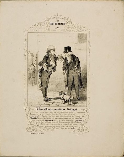 Editor: This is "Sheet Music: The Jew, or Isaac the Junkman," an anonymous print. It's quite striking, but the figures are rendered with harsh lines. How do you interpret the visual composition? Curator: The rigid lines and stark contrasts, especially in the figures' clothing, create a sense of unease. Notice how the artist employs hatching to model form, yet the background remains minimal, drawing attention to the interaction between the two men. What does the contrast in their attire signify to you? Editor: It emphasizes a difference in status, I think. The man on the left looks wealthier. It’s a powerful image, but the starkness makes it feel a little unsettling. Curator: Indeed. The formal elements contribute to a narrative, one that prompts us to consider the power dynamics being visually represented. The way the light falls on the figures also directs our gaze, wouldn't you agree? Editor: Yes, absolutely. Seeing it discussed formally definitely opens up new layers of understanding.