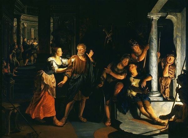 Curator: Gerard van Honthorst's “The Liberation of Peter,” created in 1618, captures a biblical scene rendered in oil on canvas. What strikes you upon seeing this? Editor: The most immediate impression is the drama of the chiaroscuro. The intense contrast between light and shadow focuses our eye and infuses the scene with a sense of the miraculous. Curator: Absolutely. Honthorst uses light here not merely as illumination but as a compositional tool. Note how the angel radiates, providing the main light source, strategically positioned to highlight Peter’s bewildered reaction. It's a fascinating study in how to use the light's structure and dispersal within a scene. Editor: And it speaks volumes about the moment being depicted. The angel is traditionally a symbol of divine intervention, hope, and salvation. The bright light emanating from the angel suggests not only the miracle of Peter's liberation, but a larger symbolic liberation from spiritual darkness. I wonder if the chain and Peter's placement hint that something more important than a single person is freed at the same time. Curator: Considering the baroque style, it’s easy to read it as a complex staging of pictorial elements rather than something with the weight of the biblical canon. Peter's robe, look at the rendering! Observe the textures, folds, and light reflecting off it; so much virtuosity here, using material structure and depth to push the baroque style. Editor: It goes beyond mere display, though. The chains, clearly meant to confine Peter, are almost incidental. The light dismisses them, indicating their powerlessness. Curator: A masterful juxtaposition of physical restraint against the unbound power of the divine as conveyed through light itself. A perfect lesson in applied aesthetics. Editor: Indeed. This artwork has sparked an awareness of the chains, the darkness we might all strive to leave behind. The symbolism offers us a beacon towards a higher level.