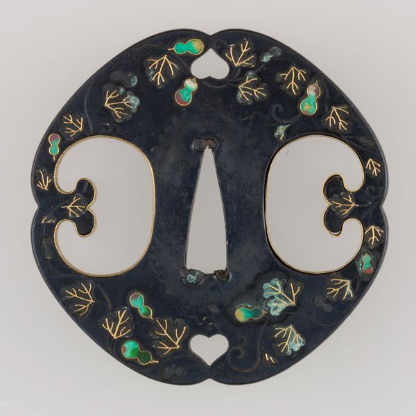 Curator: Well, hello there! We’re standing before a delightful object: a bronze calendar made around 1851 by Asprey. What catches your eye first about it? Editor: Definitely that shimmer, all that ornate golden metal. It has a decadent vibe; like time itself is a jewel to be treasured. And the scale is unexpectedly domestic, isn’t it? I want to know who woke up to that calendar every day. Curator: Indeed! Asprey was known for such luxurious goods, catering to a wealthy clientele. Calendars, particularly ornate ones like this, became increasingly popular as symbols of status and control over one’s schedule. Notice the malachite accents adding to that sense of opulence? Editor: Oh, the green cabochons! Malachite often carries associations with nature and renewal. Its addition turns time into a garden. Calendars themselves always fascinate me; they are, at their heart, symbolic systems. The organization of time has deep cultural roots, influencing everything from religious observances to agricultural cycles. Do you suppose its owner took it for granted, or were they conscious of those associations? Curator: A delicious question! Perhaps a little of both. These objects are strange cultural touchstones—on the one hand very functional, on the other laden with aspiration and ideas about ourselves and how we fit into, or above, nature's clock. To own a calendar is to partake in an old drama of meaning! Editor: Looking at it this way helps me think about my own relationship with time too. Thank you for that! Curator: And thank you! Examining these items can alter one's view—time warps! I appreciate the insights on offer.
