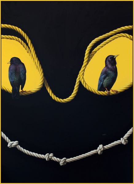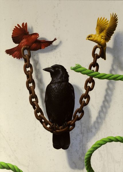 Eckart Hahn made this painting using oil on canvas, a common choice, but what is he trying to show us? At first glance, the work is simple: a black bird perched on a knotted rope, set against a stark red backdrop. But the rope is no ordinary piece of craftsmanship; it's meticulously knotted, suggesting purpose and skill. The use of oil paint allows for a smooth, almost photographic realism, drawing attention to the textures of the rope and the bird's feathers. The way Hahn renders the material is critical to the work’s meaning. The rope, with its rough texture and tight knots, is the product of manual labor. It speaks to histories of craft and functional design. The bird, as a natural element, perches on this manufactured object, creating a visual contrast between the organic and the constructed. In "Fadeaway," Hahn asks us to consider the relationship between the natural world and human intervention. He blurs the lines between fine art and craft, inviting viewers to appreciate the skill and labor inherent in the creation of both.