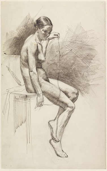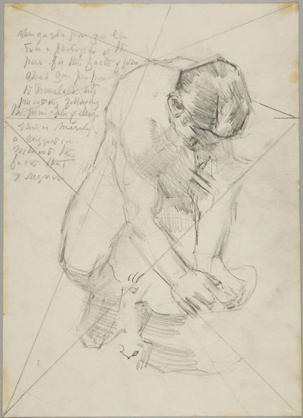 Curator: Here we have Denman Waldo Ross’s “Seated Sketch of Allen Parker.” Ross captured it in 1927, and it’s rendered in graphite on paper. Editor: There's something hauntingly beautiful about its raw energy. The figure feels caught in a moment of introspection or perhaps even exhaustion. Curator: The sketch feels alive with geometric symbolism. Ross seems preoccupied with triangles, as if attempting to box in the figure. Editor: Right. The angular lines create a sense of tension. I wonder if this reflects the anxieties of the interwar period or perhaps Ross's own struggles with representation. Curator: It could be both. Art often mirrors and shapes its time, carrying echoes of social anxieties and personal struggles within its lines. Editor: Absolutely. This sketch invites us to consider the figure within its historical context. It's a dialogue between the personal and the political. Curator: Yes, and it asks us to contemplate the enduring power of the human form. Editor: And its capacity to embody so much more than what is visible on the surface.