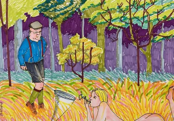 This Untitled piece was made with marker pen on paper by Kinder Album. You know, there's a directness and a certain urgency in the way the artist has approached mark-making here. It feels immediate, like a snapshot of a moment, the colors laid down flatly. I keep coming back to the way the ground is rendered. It's this intense orange-red, almost vibrating with energy, and it's made up of these little strokes all going in the same direction, kind of like short, choppy brushstrokes. It gives the ground a really tangible, almost tactile quality. It's not just a flat plane, it’s something you could almost reach out and touch. The colour palette is almost Fauvist. I wonder if they looked at Matisse? That combination of looseness and precision, it’s what keeps drawing me in. It reminds me that art isn’t about perfection, it's about process. It embraces experimentation, happy accidents, and the beauty of imperfection.