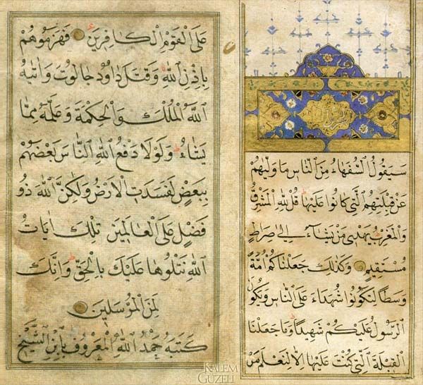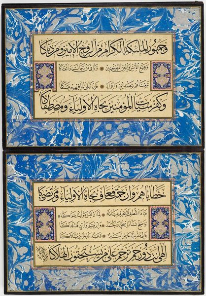 Editor: Here we have a bifolio from an album of calligraphic exercises, created by Al-Hajj al-’Arif. The swirling marbled paper surrounding the text is quite striking. What formal qualities stand out to you? Curator: The elegant juxtaposition of the rigid calligraphic forms against the fluid marbling creates an interesting tension. Note the deliberate placement of the text blocks within the frame; this creates a visual harmony. Editor: It's like a dance between order and chaos, I hadn't thought about it that way. Thanks! Curator: Indeed. Observing the interplay of structure and texture enriches our understanding.