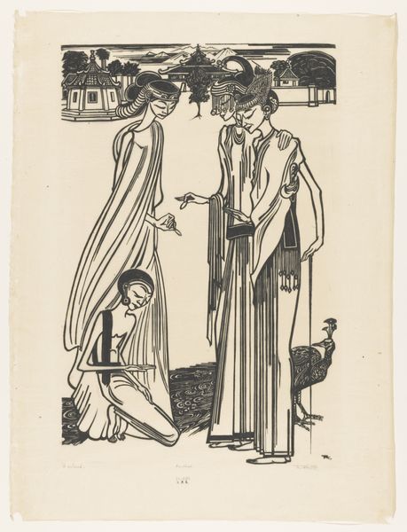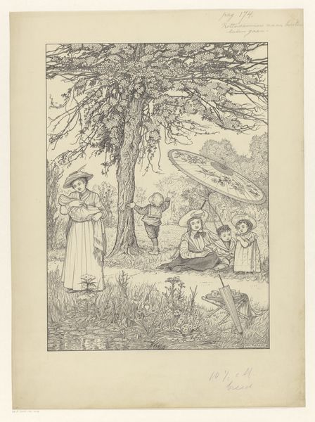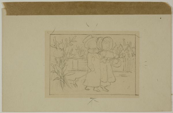 Editor: This is "Girls Going Down a Lane," an ink and pen drawing by Kate Greenaway. It’s…charming! The style feels so light and airy, but something about their dresses almost gives them an adult-like presence. What do you see in this piece, with your art historical perspective? Curator: This drawing speaks volumes through its subtle details and evokes potent memories of childhood, a world meticulously constructed through visual cues. Tell me, what’s the first symbol that jumps out at you? Editor: Maybe the hats? They're all so different. Curator: Precisely. Hats, like clothing, serve as potent symbols. The straw hats and bonnets speak of modesty, domesticity, even protection of innocence - they also reveal Greenaway’s era’s interpretation of childhood. Do you notice how these costumes, in their gentle classicism, project both an eternal quality and also echo Greek processions? Editor: I do see that! And their arrangement too... is that symbolic? Curator: The composition, carefully orchestrated, mirrors a ritual procession, yet imbued with an idyllic and nostalgic lens. Observe the repeated visual elements—the line of figures, the delicate use of line to create rhythm and movement... it echoes universal narratives. The work connects childhood, innocence, and this classical sensibility. What new perspectives did this offer you? Editor: I was caught up in the surface charm, but now I appreciate how it hints at deeper themes like innocence, memory, and even classical ideals. Curator: Exactly. Now you recognize the interplay of representation, and its reflection of a symbolic order through Greenaway's artwork!
