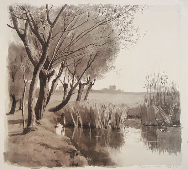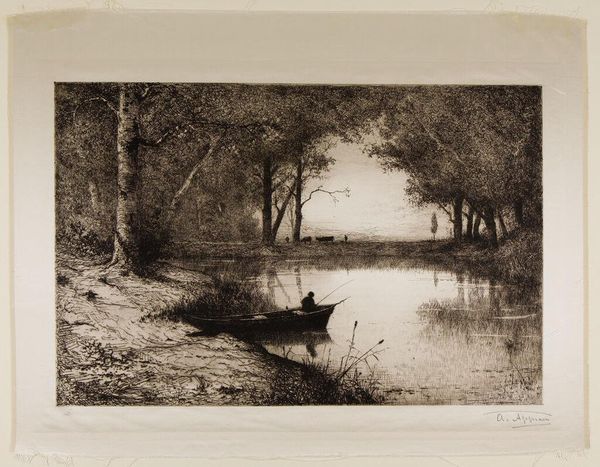Curator: Before us we have Edvard Petersen’s etching from 1899, “Ved bækken,” or "By the Brook," currently held at the SMK in Copenhagen. Editor: It feels…rustic, melancholic even. The sepia tones and the slightly hazy quality create a wistful atmosphere. Curator: Petersen certainly masterfully utilizes the etching technique to evoke a very distinct mood, wouldn’t you say? Note how the lines themselves vary in weight, defining the space and the play of light across the reedy foreground and open horizon. He uses the cross-hatching to render depth with an impressive subtlety. Editor: Yes, the density of lines really structures the composition, directing our gaze. And the contrast between the almost crude bridge construction versus the more sophisticated, almost impressionistic rendering of the water...interesting. What would this landscape have represented to Petersen? Curator: One could read the motif of the small bridge itself as symbolic, representing a transition—perhaps from the known to the unknown. The lone figure standing at its edge contemplating the vast open water lends to this sense of reflective yearning, typical in the genre painting that he embraced. Editor: Precisely. I find it fascinating that this piece also reflects rural labor: that bridge wasn’t just there, someone had to put it together with hand tools and local materials, even the distant boats are signs of life. And while appearing simple at first glance, I believe that its success actually hinges on this sophisticated negotiation between labor and leisure, doesn't it? The labor is somewhat hidden though! Curator: Perhaps, but such interpretations necessitate acknowledging the interplay between intention and reception. To consider what exactly he wanted this scene to communicate. Editor: It is not just about what he put into it. In the end, as much as Petersen wanted to highlight his technical virtuosity with this medium, it's the world represented in it—shaped by daily toil—that speaks to me. Curator: An astute observation. It serves as a compelling testament to how differing lenses can offer richer understandings of this serene landscape. Editor: I leave with a renewed interest in seeing more landscapes rendered through labor and material consciousness.