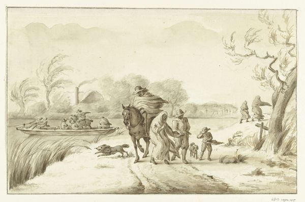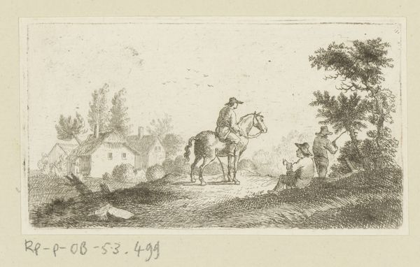 Johannes van Cuylenburgh created this etching, "Oponthoud van ruiters bij een herberg," sometime before his death in 1841. The image depicts riders pausing at an inn, offering a glimpse into the social and economic dynamics of the time. During the early 19th century, the Netherlands was navigating its identity in the wake of French occupation and the rise of a new Kingdom. This work subtly reflects the era’s class structure: the well-dressed riders on horseback contrast with the inn’s staff. The pause in their journey allows for social interactions across class lines, offering a brief intersection of different worlds. What stories do you think these figures might have to share, and how do their respective positions shape the encounters? While seemingly a simple scene, Cuylenburgh captures a moment rich with the nuances of Dutch society in transition.