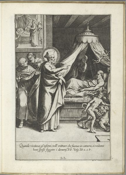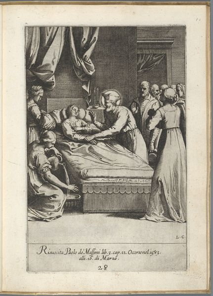Curator: Here we have Willem van Swanenburg’s 1610 engraving, "Thomas van Aquino bij een beenoperatie," which translates to "Thomas Aquinas at a leg operation." It resides in the Rijksmuseum collection and is a particularly striking example of Dutch Golden Age printmaking. Editor: Oh my. The first thing that strikes me is the, shall we say, lack of anesthetic. It feels intensely voyeuristic, almost like witnessing something sacred being violated. There's this stark contrast between the patient's apparent serenity and the focused, almost brutal activity surrounding him. Curator: Absolutely. The print captures a pivotal, if rather gruesome, moment in Aquinas’s life. Historical accounts suggest that he underwent this procedure, likely a cauterization, to alleviate pain, possibly from a boil or some other affliction. It is interesting to see how a medical procedure transforms into almost a holy moment. Editor: The figures gathered around the scene are captivating, aren’t they? The one holding the branding iron with such focused intensity and those onlookers—a mix of concern, curiosity, maybe even a touch of morbid fascination. Their expressions are so delicately rendered in this tight composition. It’s like a theatre of emotion. Curator: Indeed. Van Swanenburg really excels at conveying the psychological depth of his subjects through subtle gestures and facial expressions. It reflects a baroque sensibility in its dramatic presentation and intense emotionalism, though contained within the detailed linework characteristic of the Dutch Golden Age. Think about how engravings served as a means to disseminate knowledge, philosophical ideas, and hagiographies like this one to a wider public. Editor: It’s interesting to consider this within that framework of disseminating knowledge. This isn't just about recording a medical procedure, it seems more about conveying an ideal – almost like the saint's mind transcends the body and the material world completely during times of physical stress, highlighting his unwavering faith and inner strength. The pain barely registers. Curator: Exactly. The engraving transforms a personal medical crisis into a public demonstration of piety and spiritual fortitude. Editor: It is somewhat grim but there is also some artistry here. I like it. A snapshot of bodily intervention. Curator: An intervention with historical resonance, that’s for certain!