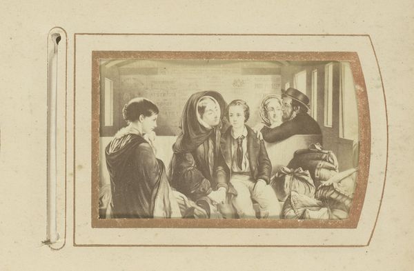 Editor: Here we have "Chess Players," a gelatin silver print dating back to the 1850s, created by Henry Maull. The photo strikes me as a study in contrasts – the dark suits against the lighter faces, the rigid poses against the suggestion of movement with the hands. How do you interpret this photograph from a visual standpoint? Curator: Primarily, I observe a conscious arrangement of forms designed to convey a sense of Victorian sensibility and stoicism. Note the near symmetrical arrangement of the figures, bisected vertically by the doorway. This establishes a certain rhythm. Further, the textures create varied reflective properties. Editor: Can you say more about the textures? What's catching your eye? Curator: Certainly. Consider the velvet collars against the etched glass. These surface modulations produce subtle tonal gradients that further highlight the contrasts between dark and light in the composition, drawing one’s eye back and forth and creating a kind of staccato across the surface. Is this an intentional effect or a product of technical limitations? Editor: That's fascinating! It makes me think about how much the materiality of the photograph itself contributes to its overall effect. I'm now also noticing how the subjects mirror each other, like pieces on the chessboard, echoing the themes of control and strategy. Curator: Precisely. It highlights how visual construction underscores thematic meaning. In your close reading, note that the framing creates meaning too; The subjects of Maull’s photograph seem staged in their respective zones to reflect the game being played. Do you perceive this intentional staging too? Editor: Yes, definitely. I see how the interplay of light, shadow, and form constructs a particular narrative, almost independent of what's actually depicted. Thanks for that, it really reframes how I see photography of that era. Curator: A deeper visual analysis almost always pays off in the end.