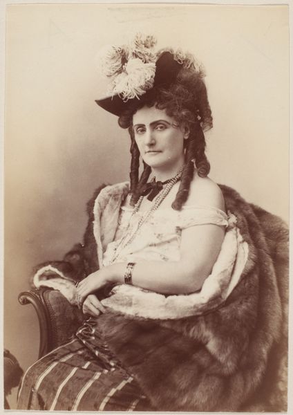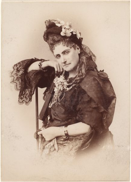 Curator: Wow, talk about a blast from the past! My first thought? The ghost of a debutante’s dream, all roses and heavy air. Editor: This gelatin-silver print is titled “[Countess de Castiglione],” from 1895, crafted by the lens of Pierre-Louis Pierson. I'm captivated by its aura, a dance of mortality and beauty frozen in time. Curator: Aura, totally! But more like an aggressively poised power stance with flowers strapped to strategic points. It’s over the top, theatrical! It's a performance of status! Editor: Absolutely. Roses were, of course, associated with Venus, and more broadly a symbol of love, beauty, and passion—but also, poignantly, of transience and decay. What message was Countess de Castiglione trying to embody here, projecting strength through this visual language of ephemerality? Curator: Hmmm, that’s deep, though those roses could also signify ambition. Like she is literally crowned with roses – "look at me, smell my success". I think she wanted to say that she’s at her peak! Editor: A very valid point, there's definitely that potent declaration. And Pierson as the photographer and stylist of her public image understood the value of iconic visuals and staged symbolic tableaux. The meticulous detailing and the staged setting evoke classical portraiture but with a very deliberate modernity. The almost photographic-realism feels radical and symbolic! Curator: It also tells of an ending. You can almost smell the decay coming of something powerful—and maybe not entirely pretty, you know? She reminds me of certain faded movie star…still clinging on tight in a youthful, dewy, desperate grip, as though beauty equals value… Editor: Ah, the pathos of the ephemeral beauty made eternally "visible". This reminds us how photography's ability to halt time’s flow reveals so much about our hopes and fears, particularly women’s place and role in a rapidly modernizing world. Curator: Agreed! Looking at her and the way this medium of gelatin-silver print almost elevates it to icon, really opens some reflection on female legacy…the performance of presence. Editor: Indeed, this photographic symbolism allows us to time-travel, to witness a very poignant dialogue between identity and its crafted representation across eras. It makes me see my own identity under a completely different gaze now…