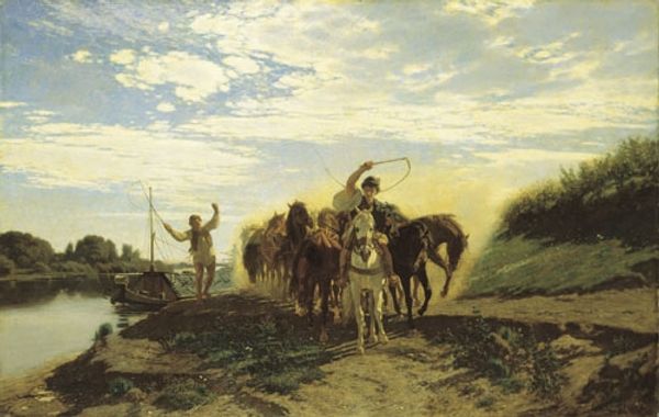 Editor: Karel Frederik Bombled's "Traveling Family on a Country Road," painted in 1881, shows a family and their animals journeying along a path. It feels like a fleeting, documentary snapshot. What can you tell us about the deeper meaning embedded in this painting? Curator: At first glance, yes, a family. But look again. Notice how their backs are turned, receding into the hazy distance. The symbols here tell a story of transience. The road itself, a common Romantic trope, signifies the journey of life, but here, it seems worn, suggesting hardship. The animals, their weary postures...it all points to the burdens of existence, doesn't it? Editor: I see what you mean. The figures aren't individualized, are they? Almost archetypal. Curator: Precisely! They represent the broader human condition, specifically a nomadic existence perhaps rooted in necessity rather than choice. The muted colors reinforce this sense of subdued resignation, reflecting a societal undercurrent of those who are often unseen. Consider also, the prominent sky. What might that symbolize? Editor: Hmm, vastness, maybe? An uncertain future? Curator: Exactly! Bombled, while rooted in Realism, taps into deeper Romantic sensibilities here, prompting us to contemplate the precariousness of life and the yearning for something more, a sense of belonging perhaps absent from their transient existence. Editor: It's remarkable how the simple image of a family walking becomes this complex exploration of societal realities. I never would have picked up on that. Curator: That’s the beauty of symbolism, isn't it? It allows art to speak to us across time and culture, reminding us of shared human experiences. This artwork definitely reflects a moment in the cultural memory and how the experience of a single family can resonate much deeper.