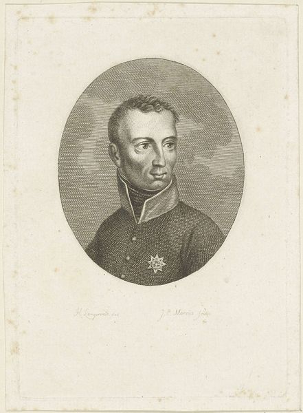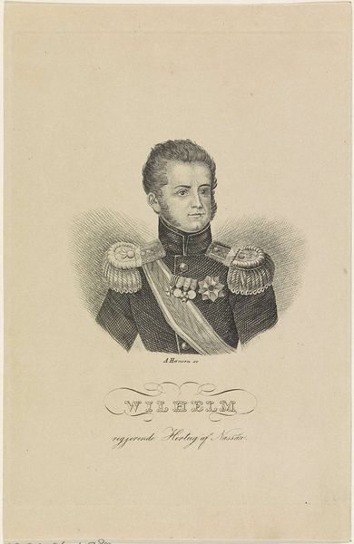 Editor: So, here we have "Portret van Willem II, koning der Nederlanden," an engraving from somewhere between 1815 and 1836. The clean lines give it a neoclassical feel. What stands out to you? Curator: The symbols, of course. Note the prominent display of medals and honors. These aren’t mere decorations; they are deliberate signifiers. What do you think they communicate about Willem II’s identity? Editor: Well, I suppose they communicate power, prestige, and maybe some form of sacrifice, given the military attire. But, in such a controlled image, does it feel… genuine? Curator: Authenticity is secondary to the message. Think about what those symbols meant to viewers at the time. The cross and the star he wears would resonate deeply, invoking specific ideas about duty and leadership, not just for the Dutch but also across Europe after Napoleon's defeat. Do you notice anything in the details around his posture? Editor: He is leaning slightly, as if injured… Is that written in Dutch at the bottom about Waterloo? That context gives the image a completely different weight. Curator: Exactly. It isn't simply a portrait; it's a carefully constructed narrative of a hero. These symbols are meant to transcend individual identity and evoke something larger, a shared cultural memory of triumph, resilience, and nationhood. Editor: I see. It's less about *him* and more about what he *represents* to the Netherlands. Thanks. It puts the piece into such a fascinating context. Curator: Indeed. The visual language employed here invites reflection on how societies create and maintain their collective identity through art.