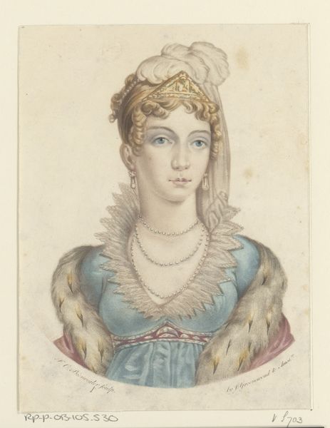 Editor: This is a lithograph from 1829, "Portret van Carolina Bonaparte, prinses Murat" by Zéphenrin Belliard. I'm struck by its ethereal quality, like a dream of royalty. The soft pinks and blues…it's almost too delicate to be real. What catches your eye most about this piece? Curator: Well, you’re right. There's a wistful romance to it. It makes me think of a pressed flower, still holding a faded beauty. I see a calculated fragility – Belliard is very carefully creating an impression of this woman that is supposed to tell us all about her. Does it work? Look at how much detail is dedicated to the jewellery versus her face - does she need it? What do you think it means that she's not directly engaging with the viewer? Editor: I think it’s strategic. Maybe the artist wants us to see her in a contemplative, powerful state. The jewellery is almost armour; it says “royal.” The averted gaze feels less inviting but maybe that’s part of the point. She doesn't NEED to charm you; she just *is.* Curator: I love that. It really speaks to the tightrope women of power walked then, doesn't it? Ornamentation versus agency - and sometimes they become entangled. The jewellery is like the cage and the key to her self expression! Maybe all the performance required of her ended up creating a mystery. Editor: It’s fascinating how much a simple portrait can suggest. I had assumed the beauty of it all was mostly superficial, but now I see something more complex. Curator: Absolutely, it’s about the artist deciding which codes of behaviour or social constraints can reveal much about her inner world! Each time I see this, I discover fresh ideas and that makes me like this piece!
