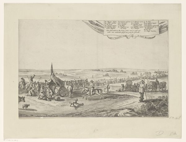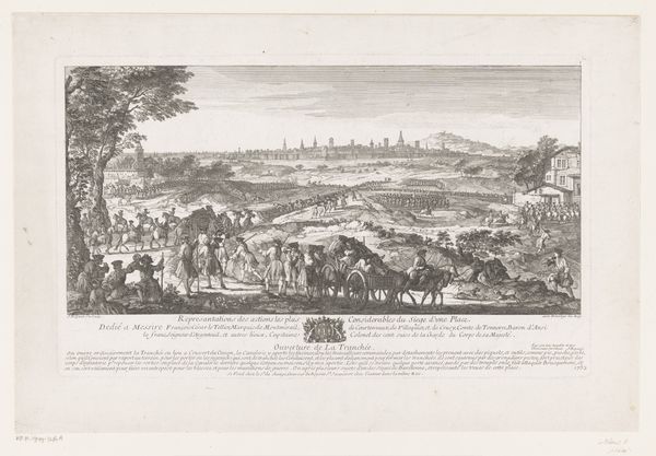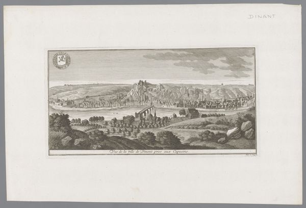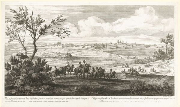 Editor: This is Jacques Rigaud's "View of Meudon Palace and Village," a print made with etching on paper, sometime between 1730 and 1740. I'm immediately struck by the sheer labor involved in creating this detailed landscape using such painstaking techniques. It gives a glimpse into a specific time and place. How do you interpret this work? Curator: Considering it materialistically, the etching process itself is key. Think of the physical effort—the crafting of the plate, the controlled corrosion by acid. This wasn't just about depicting a scene; it was about a deliberate process of reproduction, making the image accessible to a wider audience. The paper itself becomes a crucial element—its quality, its source—linking the artwork to networks of trade and consumption. How does the existence of such reproduction alter the meaning of the landscape? Editor: So, it's not just about the view of the Palace, but also the means by which that view was made available? Curator: Precisely. It forces us to question the hierarchy. Is the 'high art' of landscape painting inherently more valuable than the 'craft' of printmaking? By focusing on the labor and materials, we can see how this print blurs those lines, revealing the complex social and economic forces at play. Think of the cost involved, and who had access to prints like these. It's an early form of mass media, influencing perceptions of place and power. The materiality reveals access! Editor: That's a very different way of seeing it! I was focused on the landscape itself, but you've shown how the process of creating and distributing this image changes how we should think about its value. Curator: And isn’t it fascinating how a seemingly simple print reveals layers of material history and social context?