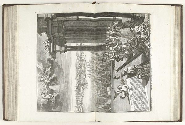 Curator: What strikes me first is the incredibly fine detail rendered across this double-page spread. Editor: Indeed. This print, titled "Bestorming en verovering van Gaeta, 1707" by Johann August Corvinus, and made between 1712 and 1715, demonstrates incredible skill with the engraving medium. The labour involved must have been extensive. Look at the tiny marks, lines, and hatching, all contributing to this highly detailed image. Curator: Formally, the composition draws your eye in, doesn't it? The central framed image depicting the naval assault is flanked by elaborate ornamental borders. There’s almost a mirroring effect, enhancing its symmetry. Editor: Precisely, the print's success lies not only in the craftsmanship but in its socio-historical context. Prints like these played a crucial role in disseminating information about battles to a wider audience. Mass production enabled a new form of access, offering visualizations of key historical and political events beyond the elite. Curator: Good point. Although printed, its decorative and allegorical framing nods toward high art—figures and emblems abound. The level of detail makes me want to inspect it closer, scrutinize it like a unique object rather than a simple mass produced illustration. Editor: Yes, there is this tension here—the function of printmaking versus this demonstration of refined technique. These visual representations served as a potent tool to reinforce state power, crafting specific narratives of triumph and dominance that impacted the society of the time. What was being traded beyond just paper? Curator: The very paper it’s printed on suggests a story of material production and value. Even the binding would signify economic value to its commissioners, a way of elevating propaganda through craftsmanship and embellishment. It reminds me to consider the accessibility to this artwork. Who exactly got to own a volume like this, to view this work? Editor: Exactly! By understanding printmaking as a process interwoven with commerce, labor, and statecraft, we glean how such artwork not only depicted history, but became instrumental in making history itself. Curator: It's been truly eye-opening to examine this work with its artistic form alongside its profound political underpinnings. Editor: Agreed. The confluence of technique, medium and social context here provides, literally and figuratively, a wealth of insight.