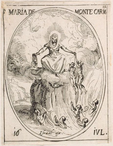 Editor: This is Jacques Callot’s "Immaculate Conception." It’s a rather small etching. The figure seems to float ethereally, doesn’t she? What do you make of Callot’s compositional choices here? Curator: Observe the meticulously rendered lines. Notice the intricate hatching used to define form and create tonal variations, especially in the drapery. This technique heightens the symbolic contrast between the celestial figure and the earthly dragon. Editor: The density of the lines really does create a strong sense of depth. Curator: Indeed. Callot's expert handling of line and form elevates this small work to a powerful visual statement. The composition is also very structured, isn't it? Editor: I see that now! Thanks for pointing out the visual structure and the detailed etching work.