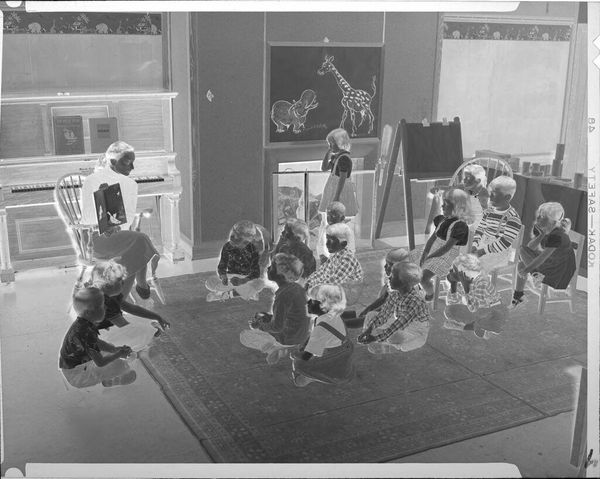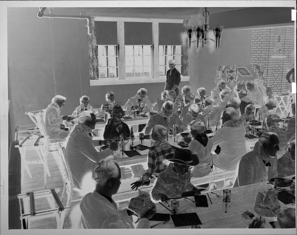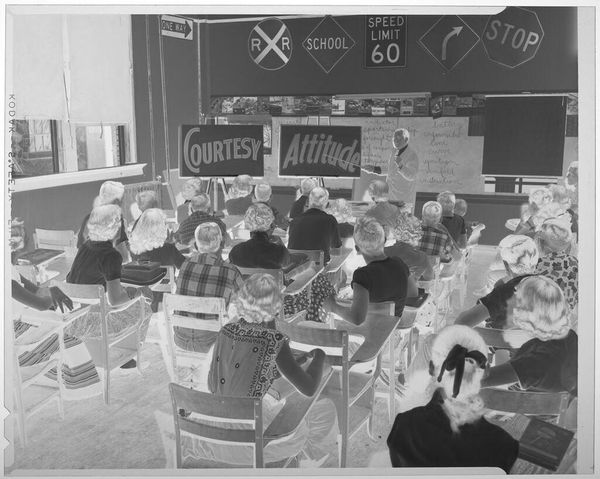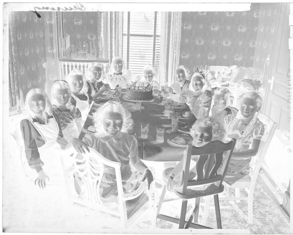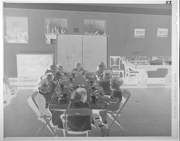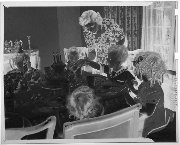 Editor: This photograph by Lucian and Mary Brown depicts children eating at a table, with adults helping them. I find the composition quite intriguing due to the stark contrast of light and shadow. What do you see in terms of formal qualities? Curator: The rigorous geometry of the table bisecting the frame establishes a clear foreground and background, while the high contrast accentuates tonal variations. How does this affect your reading of the photograph? Editor: I think it emphasizes the textures and shapes, drawing my attention to the arrangement of objects on the table and the forms of the figures. I hadn't considered how such stark contrasts could contribute to a dynamic composition. Curator: Precisely. The manipulation of light serves as a powerful tool for structuring our gaze and prompting an exploration of form. It is an interesting experiment in photographic formalism.