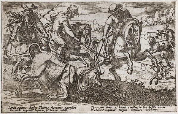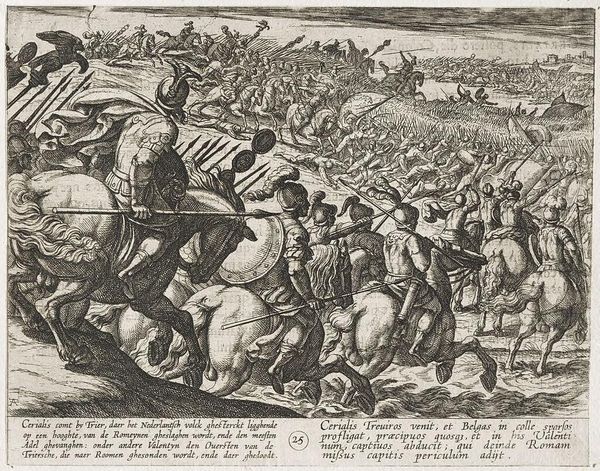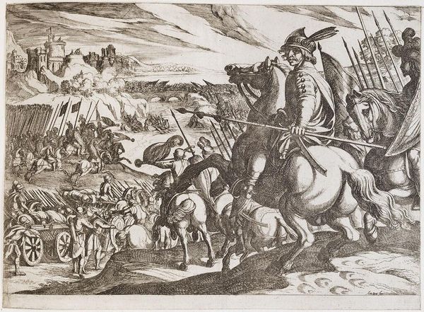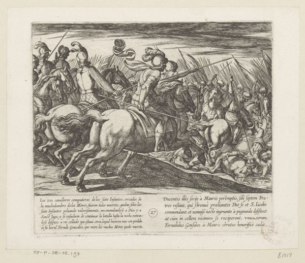 Editor: Antonio Tempesta’s “All of the Horsemen Accompanying the Infantes Are Slain, as Well as the Infante Fernan Gonzalez” is an intense scene. The composition feels so chaotic and violent. What symbols do you see at play here? Curator: Consider how the image contrasts the orderly ranks of the horsemen with the chaotic pile of the slain. This juxtaposition can symbolize the clash between order and chaos, civilization and savagery. Does this resonate with any historical narratives you know? Editor: I hadn't thought about it that way. It makes me think about power struggles and how they are often represented. Curator: Exactly! Images of fallen heroes and victorious foes, particularly in the context of battle, often reinforce or challenge existing power structures and cultural values. Remember that the visual language speaks volumes about collective memory. Editor: It’s amazing how much a single image can convey about cultural memory and power dynamics.