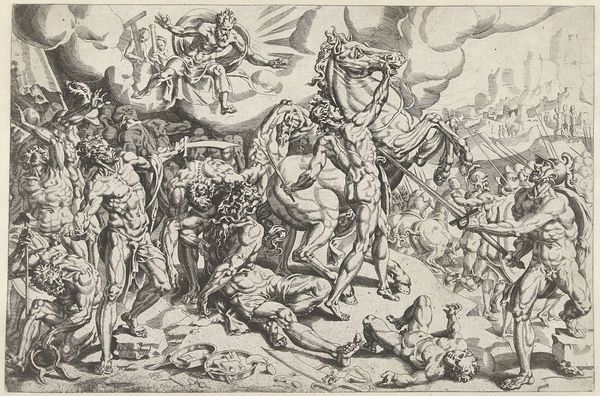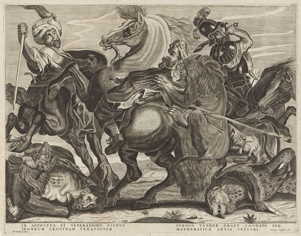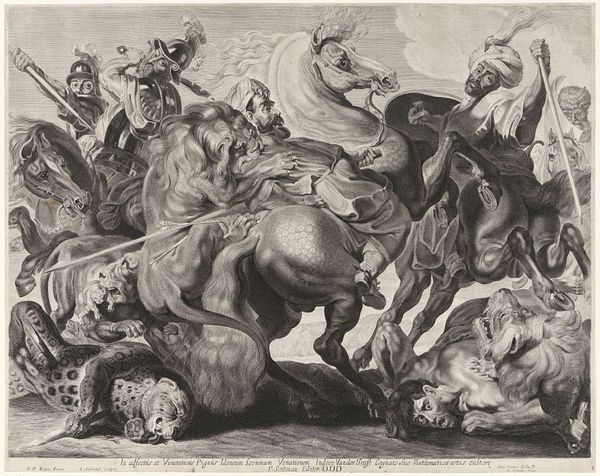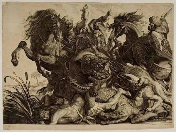 Editor: This engraving, "Jacht op nijlpaard en krokodil," or "Hunt for Hippopotamus and Crocodile," created by Willem van der Leeuw sometime between 1613 and 1665, is incredibly dynamic. The chaotic scene of hunters battling these powerful animals just leaps off the page. How might we interpret the cultural significance of this work? Curator: It's essential to consider the context. Prints like these played a crucial role in disseminating imagery and ideas in the 17th century. The "exotic" hunt, a clash between Europeans or those coded as "other," and wild animals, served as a demonstration of dominance and control over the natural world. How does the artist portray that dominance visually? Editor: I notice the hunters are actively attacking, while the animals are largely on the defensive, overwhelmed by numbers. Is there something about the clothing of the hunters that reinforces this dominance? Curator: Exactly. Note the details: some hunters are in elaborate, almost theatrical clothing, distinct from the somewhat classical, less adorned figures wrestling the crocodile below. Consider the role of printmaking during this era; this wasn't simply an artistic expression, but a form of visual rhetoric contributing to an emerging European identity often constructed in opposition to the 'exotic other.' Did prints like these help to form public opinion? Editor: I imagine they did, shaping perceptions of foreign lands and peoples and of man’s place in the natural order. The scene is exciting and violent but clearly promotes a sense of European power. Curator: Precisely. By examining the print within its historical and cultural context, we see how art served to shape, reinforce, and disseminate ideology. Editor: I hadn't fully appreciated the role of prints in shaping those early perspectives. I'll certainly look at similar works with a different lens now.