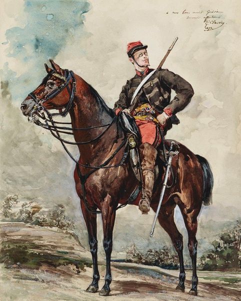 Curator: Théodore Géricault’s "The White Horse Tavern," housed here at the Harvard Art Museums, presents a seemingly simple scene. Editor: The composition, though, has this strange diagonal pull, almost as if the scene might tip forward. Curator: It’s the liminal space of transition, literally a stopover. Horses, since antiquity, have symbolized power, virility, and even freedom. The weary rider and the two horses signify the toils of journeys. Editor: The painting’s materiality strikes me too. Notice the thick impasto in the horses’ coats versus the thinner washes in the cloudy sky. Curator: Indeed, Géricault's brushwork intensifies the drama, mirroring the social tensions of post-Napoleonic France, I think. A society in flux. Editor: I see it as a study in contrasts, a moment captured using light and shadow. The artist definitely had a gift for texture.