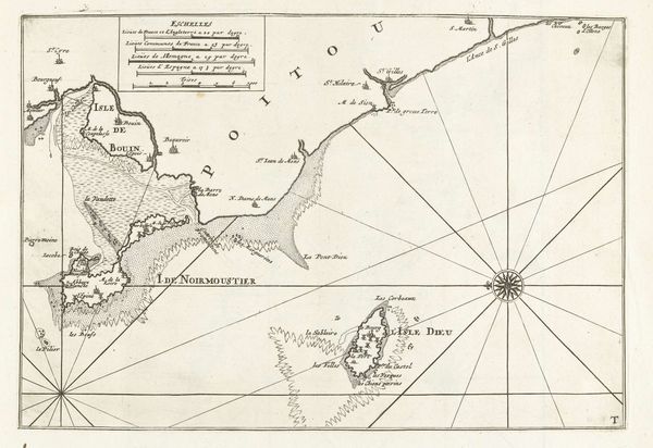 Editor: This graphic art print, "Kaart van de Franse kust tussen Cherbourg en Granville," dating back to around 1702, offers such a precise look at the French coast. The precision makes me think of math, the exact opposite of how I approach art! What stands out to you when you look at this? Curator: Math? Maybe you're on to something! Those radiating lines... almost like a spider web spun across the sea. It's tempting to see this simply as a functional map, which it undoubtedly was. But the meticulous engraving elevates it, don’t you think? It becomes an almost obsessive act of documenting the world. I can't help but imagine the artist, leaning over a table, painstakingly etching each little cove. Did he feel like a god creating landmasses, or just a civil servant? Editor: That image is perfect. I wonder if that obsessive quality was a sign of the times? Curator: Well, maps were power. This wasn't just about pretty landscapes. It represented control, navigation, maybe even invasion. That tension – between artistry and intent – makes it endlessly fascinating. What do you make of the lettering, all that precise text squeezed onto the page? Editor: The text almost becomes a design element itself! Like the land needs to be captured not just in shape but name as well! Thinking about that need, and the spider web image, makes the act feel even more assertive! Curator: Absolutely! It reminds us how much we impose our own frameworks onto the natural world. And sometimes, just sometimes, that imposition leads to unexpectedly beautiful results. Editor: Thanks! Looking at it with invasion and frameworks in mind really gives it a whole other meaning! Curator: Exactly! Sometimes the most illuminating paths begin from what seems a bland piece.