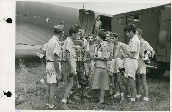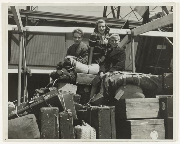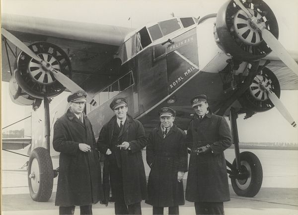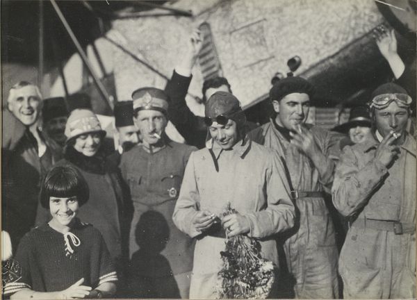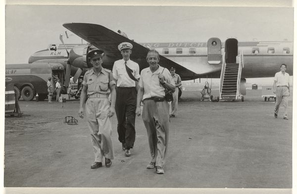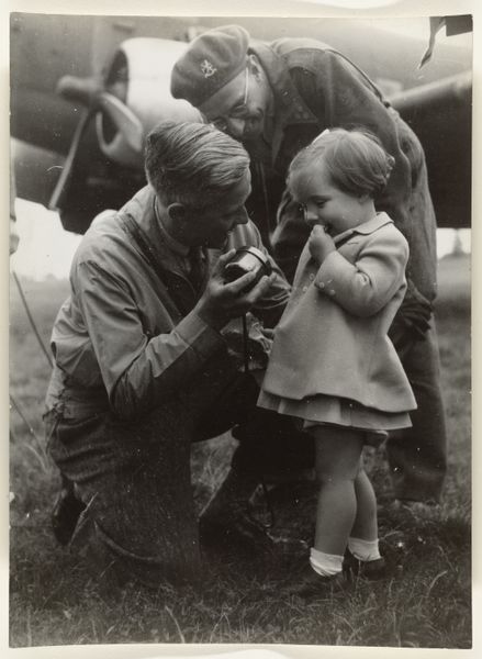 Editor: This gelatin silver print, titled "Veldmaarschalk Montgomery," is dated possibly 1945 and attributed to Canadian Army Overseas Photo/ Holland. I'm struck by the seemingly informal setting – the plane in the background juxtaposed with what looks like a chance meeting. What do you see in this piece? Curator: Immediately, I notice the power of symbolic interaction at play. The plane represents modernity and military might, a symbol of the ongoing conflict. But the presence of the young man, holding a book – a symbol of knowledge and the future – creates a powerful tension. Notice how Montgomery is posed: his pointing gesture could signify guidance, strategy, even dominance. But is it, really? Editor: That's interesting! I hadn't thought of the book as symbolic in that way, but now that you mention it, it does add a layer of complexity. What do you make of Montgomery's attire? Does it tell us something about how he wants to be perceived? Curator: Precisely. While his beret indicates military rank, the overall casualness of his dress seems designed to project an image of accessibility and approachability. He wants to be seen as a leader, yes, but also as a man of the people, even to this young, hopeful civilian. It plays on the collective memory of sacrifice and shared purpose. Look closely at the shadows on both faces: Do you perceive a similarity between these men, hinting at a shared determination, purpose, resolve? Editor: I see what you mean. There's a definite contrast between the symbols of war and the hope of youth. This makes me see how even a seemingly straightforward photo like this can contain layers of meaning. Curator: Absolutely. By carefully examining these symbols, we unlock the emotional and cultural weight carried within this image and begin to understand how these meanings were created and continue to evolve in our collective memory. What's your impression now? Editor: I am more attuned to seeing symbols and unspoken stories of hope, influence, and memory, all thanks to the clues you revealed.